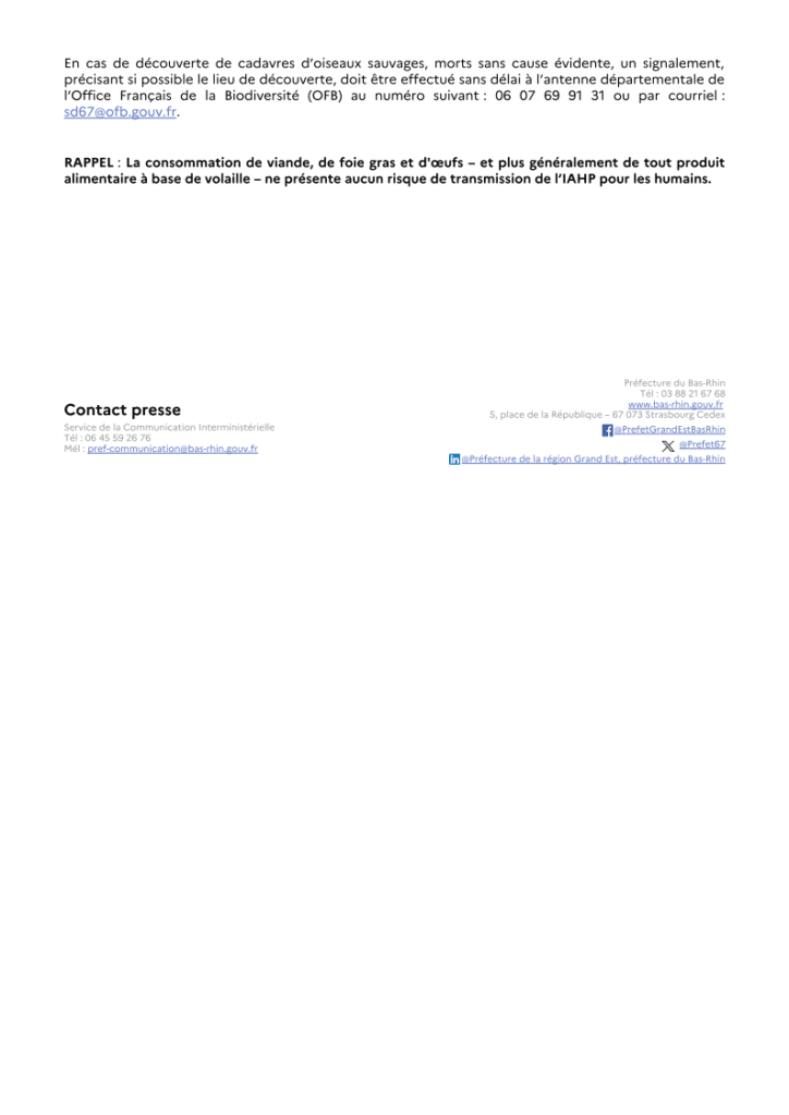 Soyez vigilants, protégez vos volailles et oiseaux d’élevage et alertez si vous êtes témoins de situations d’oiseaux morts (06 07 69 91 31 – Office français de la biodiversité)