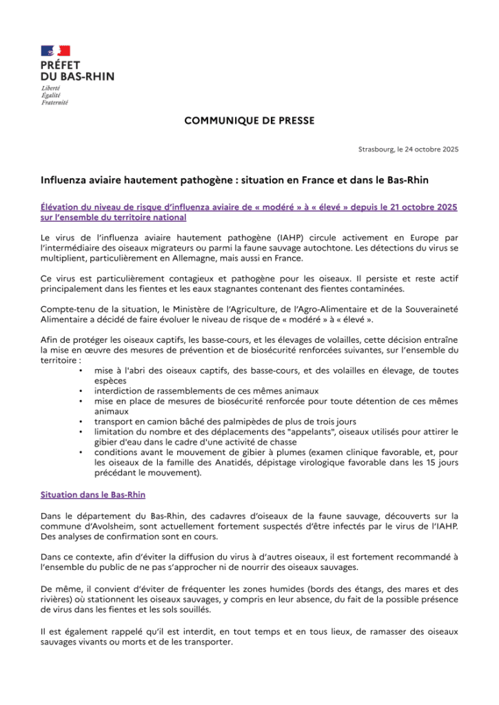 Le virus de l’Influenza aviaire circule en ce moment. Un oiseau mort a été découvert à Huttendorf.